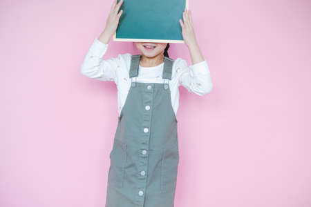 Portrait beautiful cute asian child girl on pink background with drawing board holding in hand