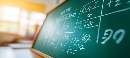 A classroom with a chalkboard featuring intricate equations and diagrams, symbolizing the pursuit of knowledge and the educational journey of students and educators alike.
