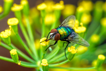 common green bottle fly, Lucilia sericata, resting in a plant in summer. Palencia, Spain.