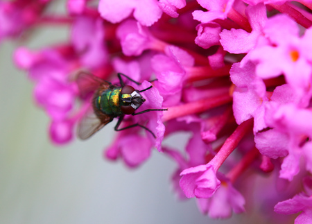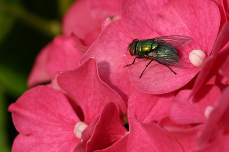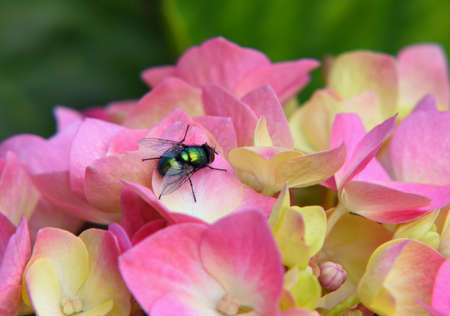 Green Bottle Fly on Pink Hydrangea Flower.