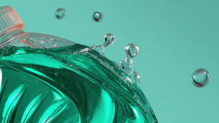 Close-up view of a green liquid inside a bottle, with water droplets splashing on a light background, emphasizing freshness and clarity.