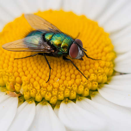 Fly on a chamomile flower. Close-up