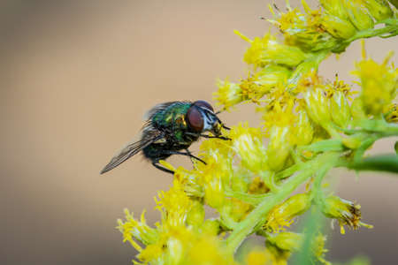 fly on yellow goldenrod flowers close up