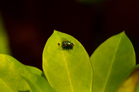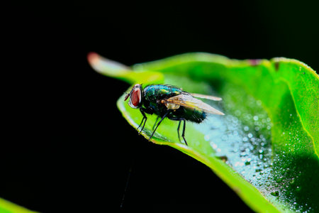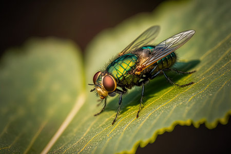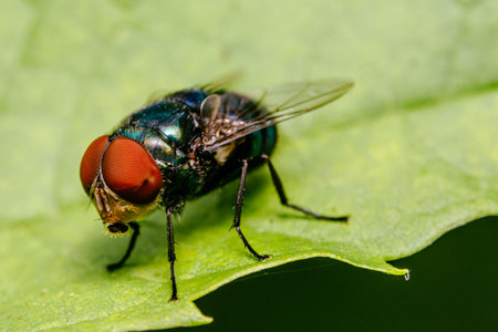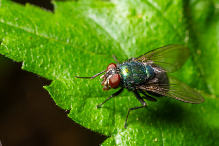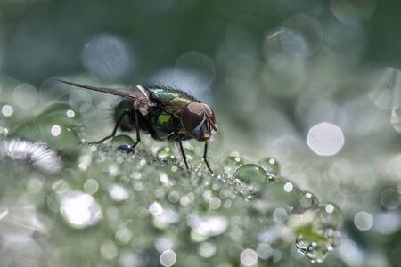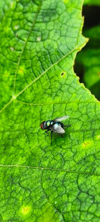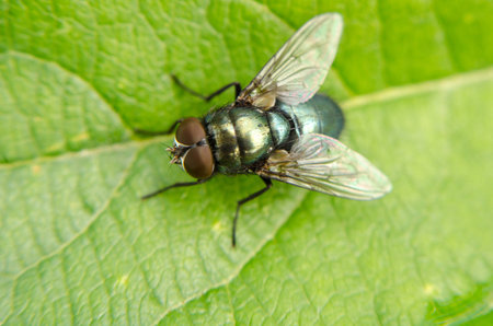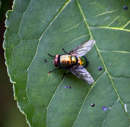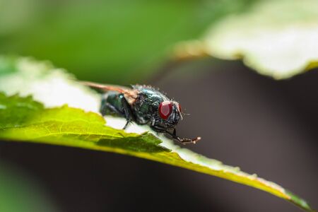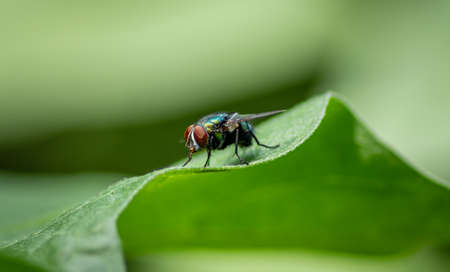 Housefly on a green leaf in the garden close up macro photograph