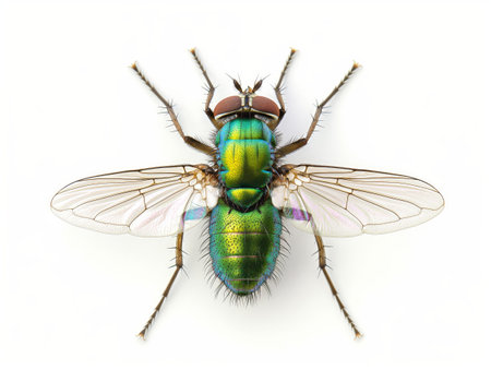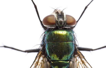 Macro shot of a green fly with detailed wings and iridescent body isolated on white background.