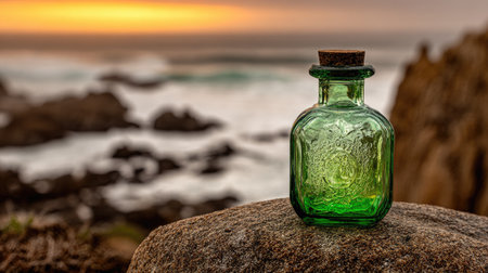 Green Glass Bottle on the Rocks near the Ocean with a Sunset Sky