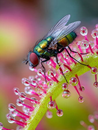A striking close-up captures a glossy green insect delicately resting atop a damp, predatory flora adorned with shimmering droplets and soft pastel tentacles in a ge