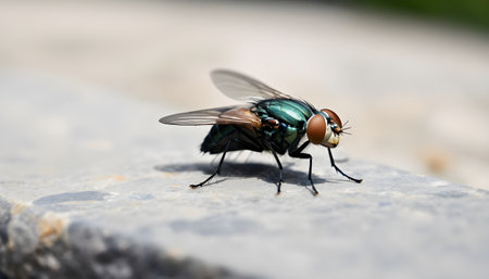 A fly rests on a rock in the sunlight