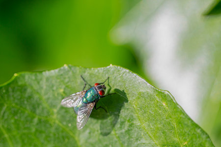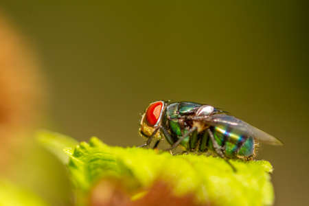 Macro shot of metallic green fly with red eyes on leaf