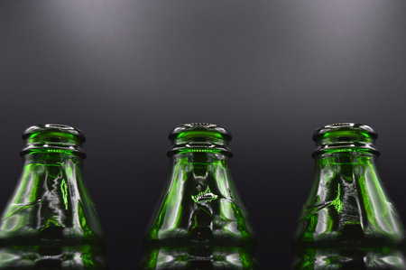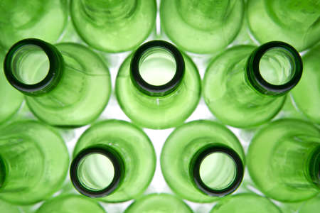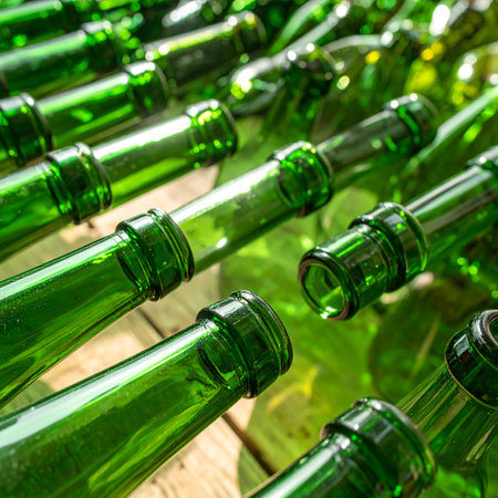 Close up of many empty green glass bottles with their necks facing the viewer. Clear details and vibrant colo...