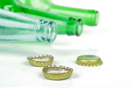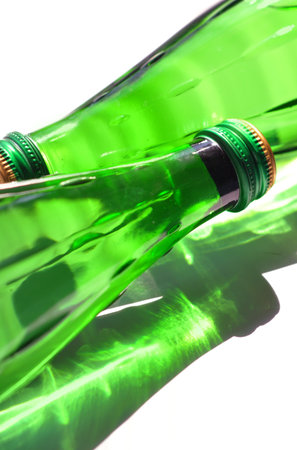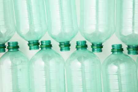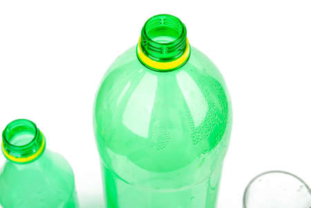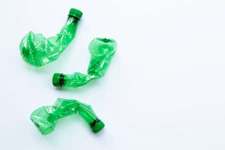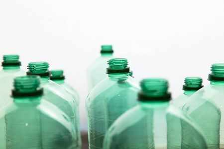 Used plastic green bottle on white background. Sorted plastic material for waste sorting and recycling