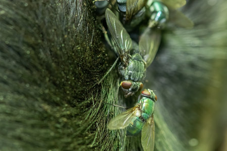 A macro shot of a greenbottle fly collecting pollen from some spiraea japonica blossom.