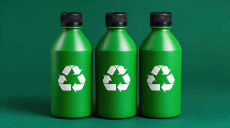 Three green bottles with recycling symbols sit on a matching green background, highlighting the importance of sustainability and eco-friendly practices in packaging.