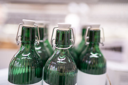 Close-up of several green glass bottles with swing top seals in a bright indoor setting
