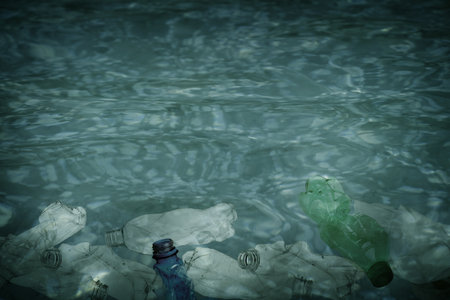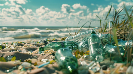 Problem of plastic bottles and microplastics lying on the shore near water of sea or ocean. Marine plastic pollution concept background