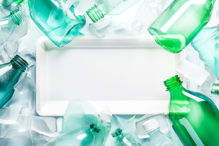 Plastic waste. Crashed empty colored plastic bottles on white background with space for your text. Plastic utilization and no plastic concept. Ecological problem. Template, copy space. Generative ai