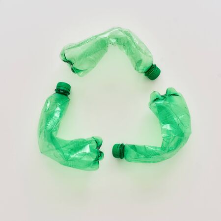 Top view of recycle symbol made of used green plastic bottles. Recycling waste concept