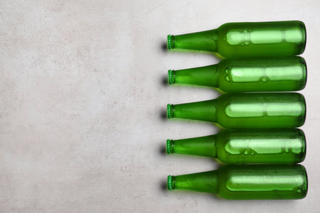 Glass bottles of beer on light gray background, flat lay. Space for text