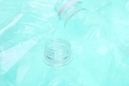 Pile of crushed plastic bottles in blue tones. Piles of water bottles with blue color are various sizes and shapes. Environmental and recycling. Plastic waste and the environmental impact. AIG35.