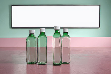 Green glass bottles arranged in a symmetrical pattern. Generative AI