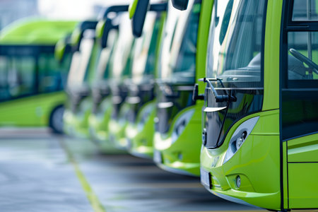 Modern Green Electric Buses in a Row, Eco Friendly Public Transportation, Clean Energy