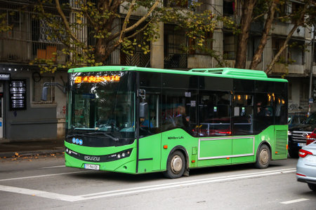 Tbilisi, Georgia - September 19, 2025: Green urban midibus Anadolu Isuzu NovoCiti Life at the city street.