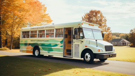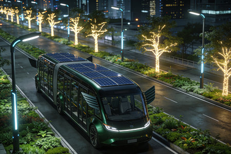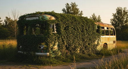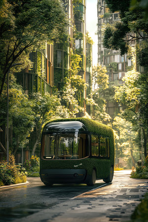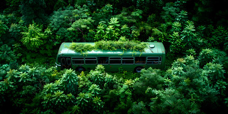 A green bus surrounded by lush foliage showcasing sustainable mobility and ecofriendly transportation options. Concept Sustainable Mobility, Eco-Friendly Transportation, Green Bus, Lush Foliage