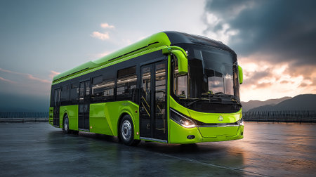 A modern green electric city bus is displayed outdoors against a mountain backdrop. Its design features clean lines, large windows, and a contemporary aesthetic, symbolizing sustainable public transportation.