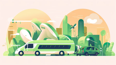 Eco friendly electric buses showcasing green logos, symbolizing commitment to sustainable and responsible public transport