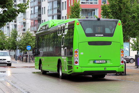 Boden, Sweden - August 20,2021: Rear view of a green public transportation Scania city bus.