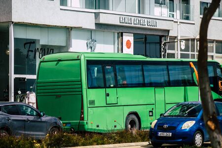 Limassol Cyprus March 20, 2020 View of a traditional intercity bus rolling in the streets of Limassol in the afternoon