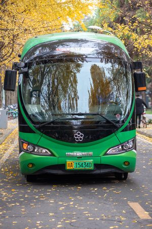 Chengdu, Sichuan province, China - Dec 1, 2018 : Electric green bus in the street in autumn