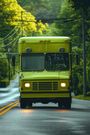 Bright Green Delivery Truck on Serene Suburban Road with Lush Greenery and Wet Pavement.