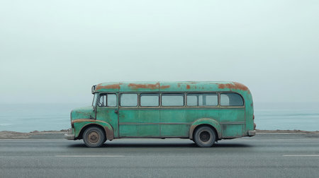 A retro bus in faded green travels along a coastal highway, slightly to the left. The sea is pale blue, the sky washed-out. Simple lines, soft lighting, serene vibe.