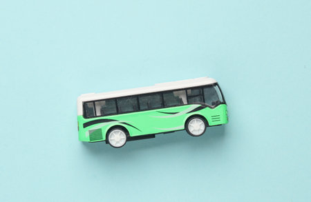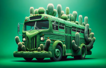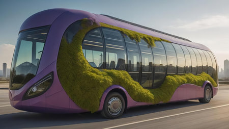 A striking image showcasing a bus on a green background surrounded by fresh leaves, symbolizing eco-friendly travel and sustainability in modern transportation.