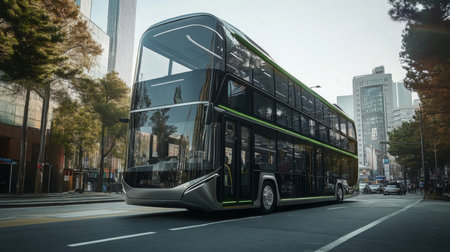 Futuristic Green Urban Transport: Hydrogen or Electric Buses for Sustainable Energy. Concept Urban Transport, Sustainable Energy, Futuristic Technology, Hydrogen Buses, Electric Buses