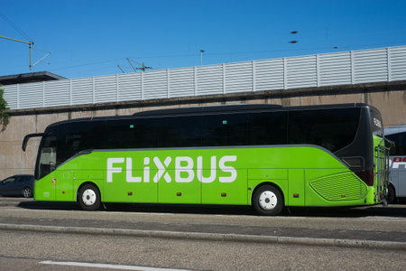 Kehl - Germany - 2 july 2022 - View of green flixbus in rton of the train station in the street, flixbus is the famous intercity travel company
