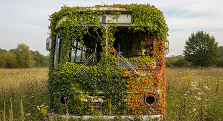 Bus. Ecological concept. Bus made of green vegetation in the forest