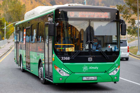 City green bus driving down the Almaty street with a driver wearing a protective mask driving
