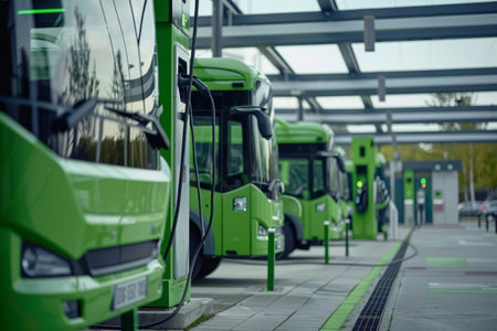 Fleet of Green Electric Public Buses at a Modern City Station with Clean and Green Energy Focus