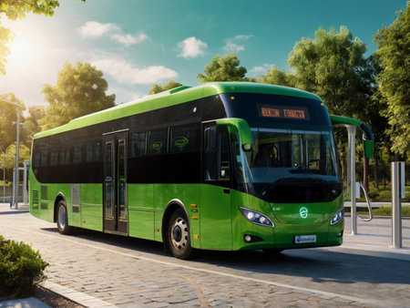 Electric bus parked at charging station ready for ecofriendly transportation. Concept Eco-friendly Transportation, Electric Vehicles, Charging Stations, Clean Energy, Sustainable Travel