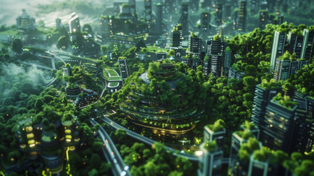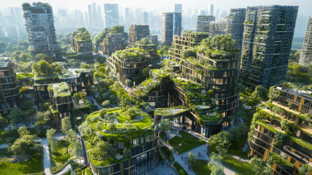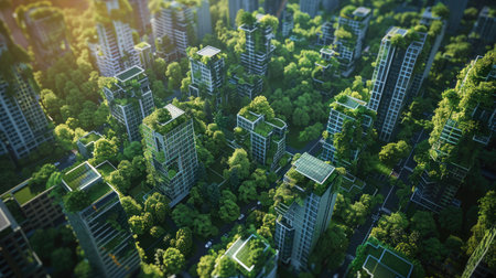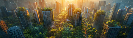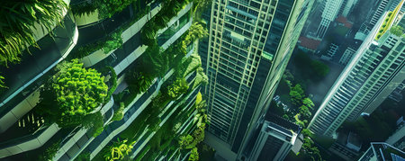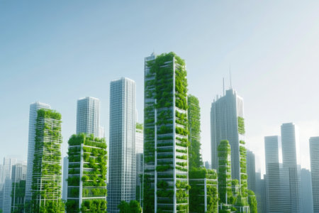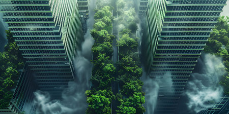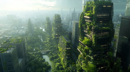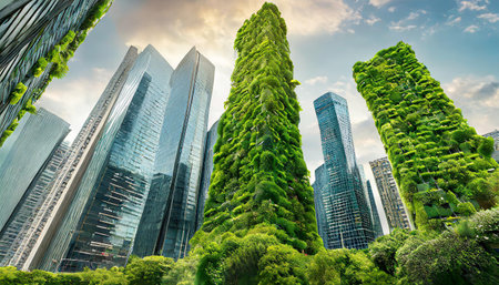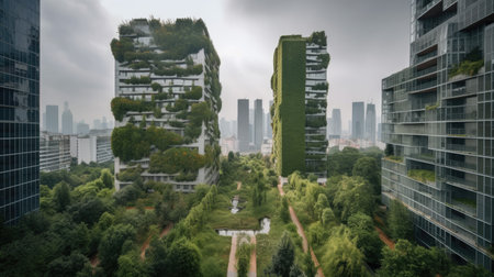 civil architecture and natural biological life combine a splendid environmental awareness city with a vertical forest concept of a metropolis covered with green plants,