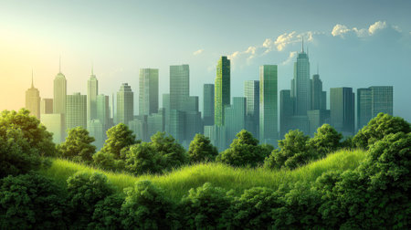 A city skyline in the background, surrounded by lush green trees and wind turbines, symbolizing urban sustainability and clean energy production. The photo is taken from an aerial perspective with soft lighting to highlight the details of nature against the human-made buildings. --ar 53:30 --v 6.1 Job ID: 3221f49e-f72e-4a27-8cf2-fc997e3585bf