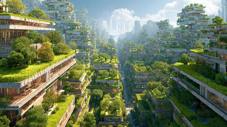 a future cityscape,buildings green plants and trees,modern architecture and futuristic design