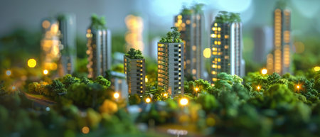 Miniature cityscape featuring skyscrapers and greenery, symbolizing urban sustainability and nature