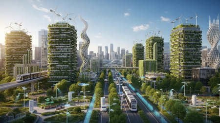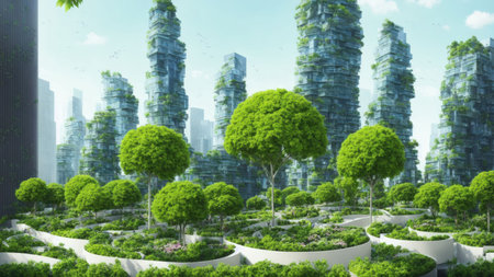 An illustration depicts a futuristic city with high-rise buildings covered in greenery. A central thoroughfare features moving vehicles, alongside a transportation system. The composition is vibrant with blue skies and natural light. It might be used for projects that involve ecology, urban planning, environmental design, or technology.