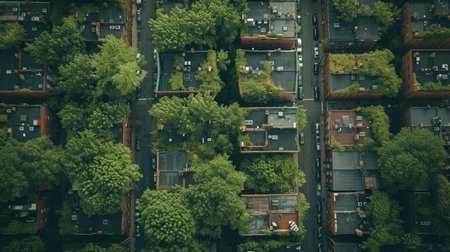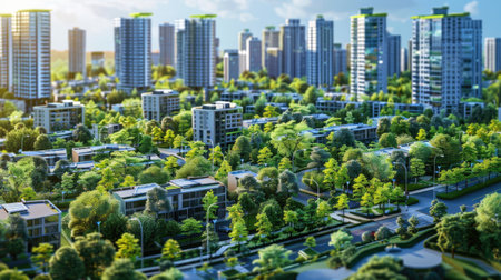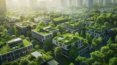 3D illustration of a cityscape with green rooftops and trees, highlighting urban environmental sustainability with this inviting photo.