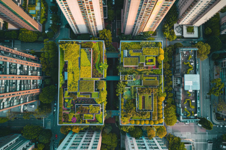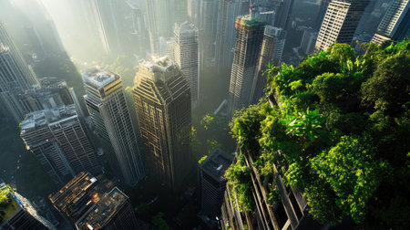 This aerial image showcases a vibrant urban landscape with lush greenery atop skyscrapers, highlighting the blending of nature and city life in a modern metropolitan environment.