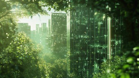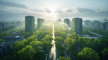 This captivating urban landscape showcases the blend of modern architecture and lush greenery, featuring glass buildings reflecting nature. The scene highlights the harmony between urban life and the environment, demonstrating the importance of integrating green spaces in city design.