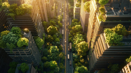 Experience a stunning aerial perspective of a vibrant urban landscape where sleek skyscrapers meet lush greenery, showcasing a harmonious blend of nature and modern architecture.